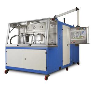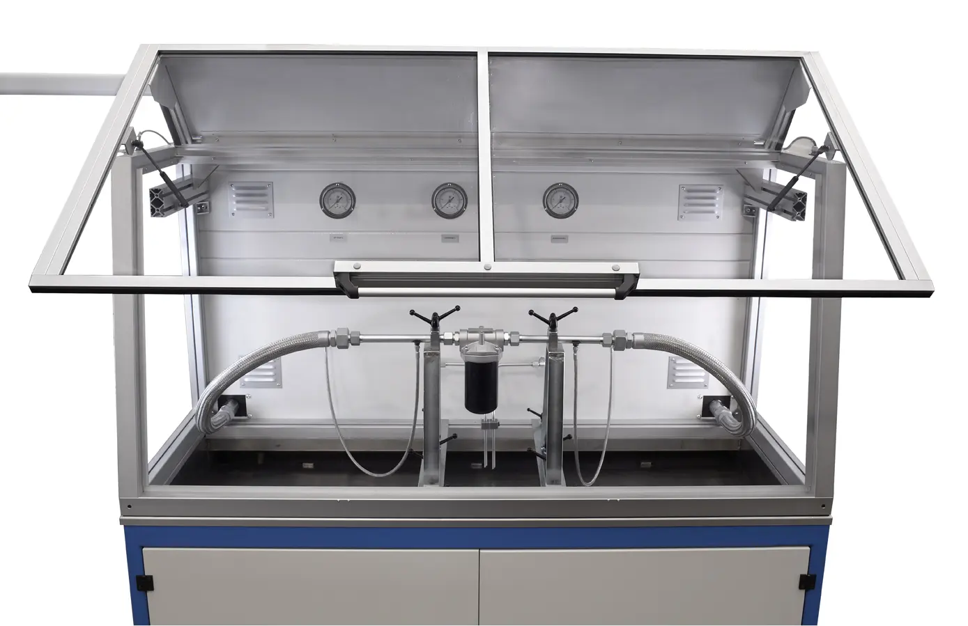 Il banco prova filtri BCF25020ES dispone di due postazioni indipendenti ed esegue test filtri in accordo alle specifiche ISO3968. DATI TECNICI: • Pressione massima di lavoro 20 bar • Temperatura massima di lavoro 150°C • Temperatura minima di lavoro 20°C • Viscosità massima di lavoro 100 cst • Viscosità minima di lavoro 2 cst DISPOSITIVI DI SICUREZZA: • Interblocco elettrico all’esecuzione del test in caso di sportello aperto • Finestre in policarbonato per la visualizzazione degli elementi sotto test • Fungo di emergenza • Interruzione automatica in caso di qualsiasi anomalia di funzionamento del banco ALIMENTAZIONI: • Tensione standard di 400 V – 50 Hz – trifase (voltaggi speciali su richiesta) OPTIONAL: • Sistema di inserimento, controllo e misurazione acqua contaminante.