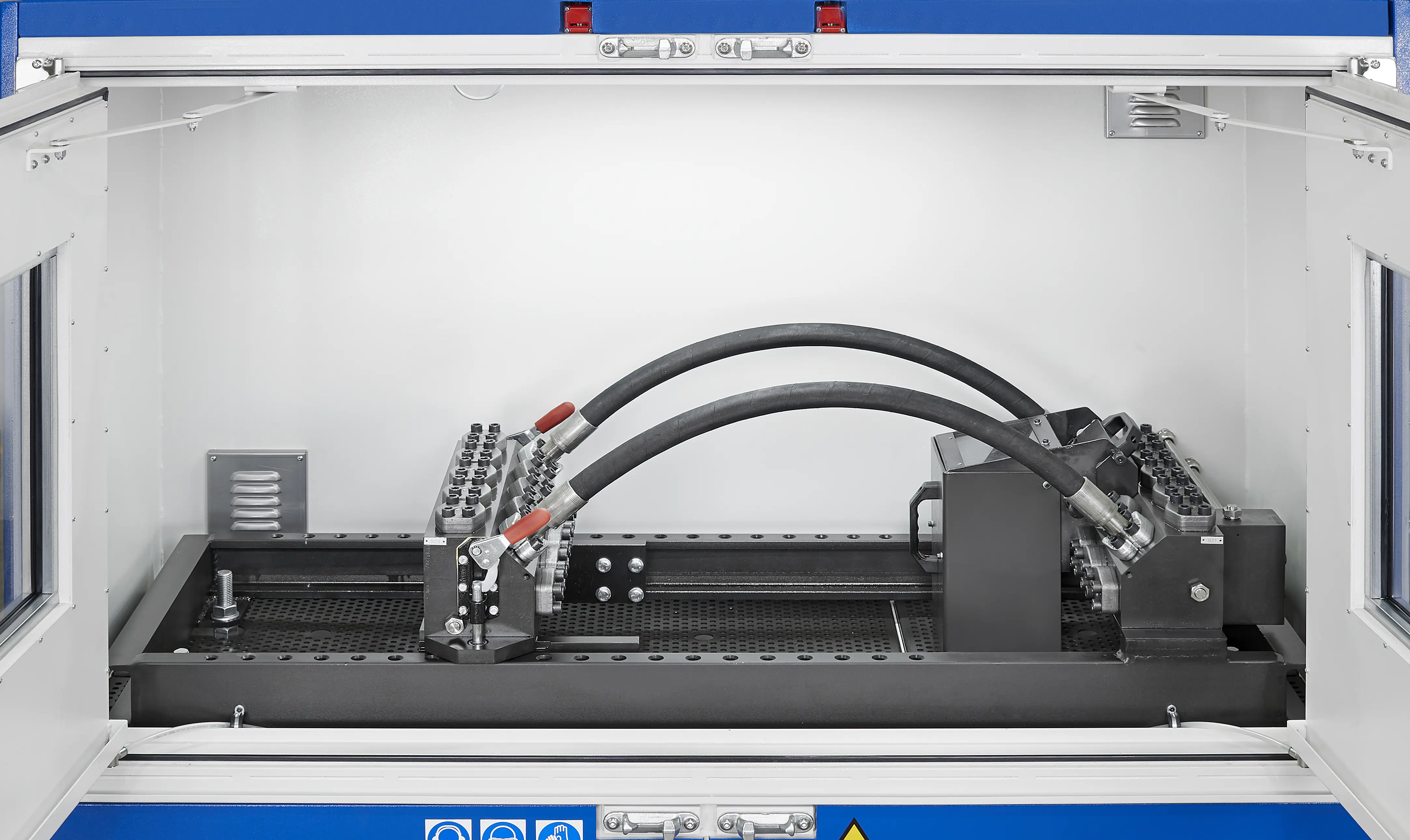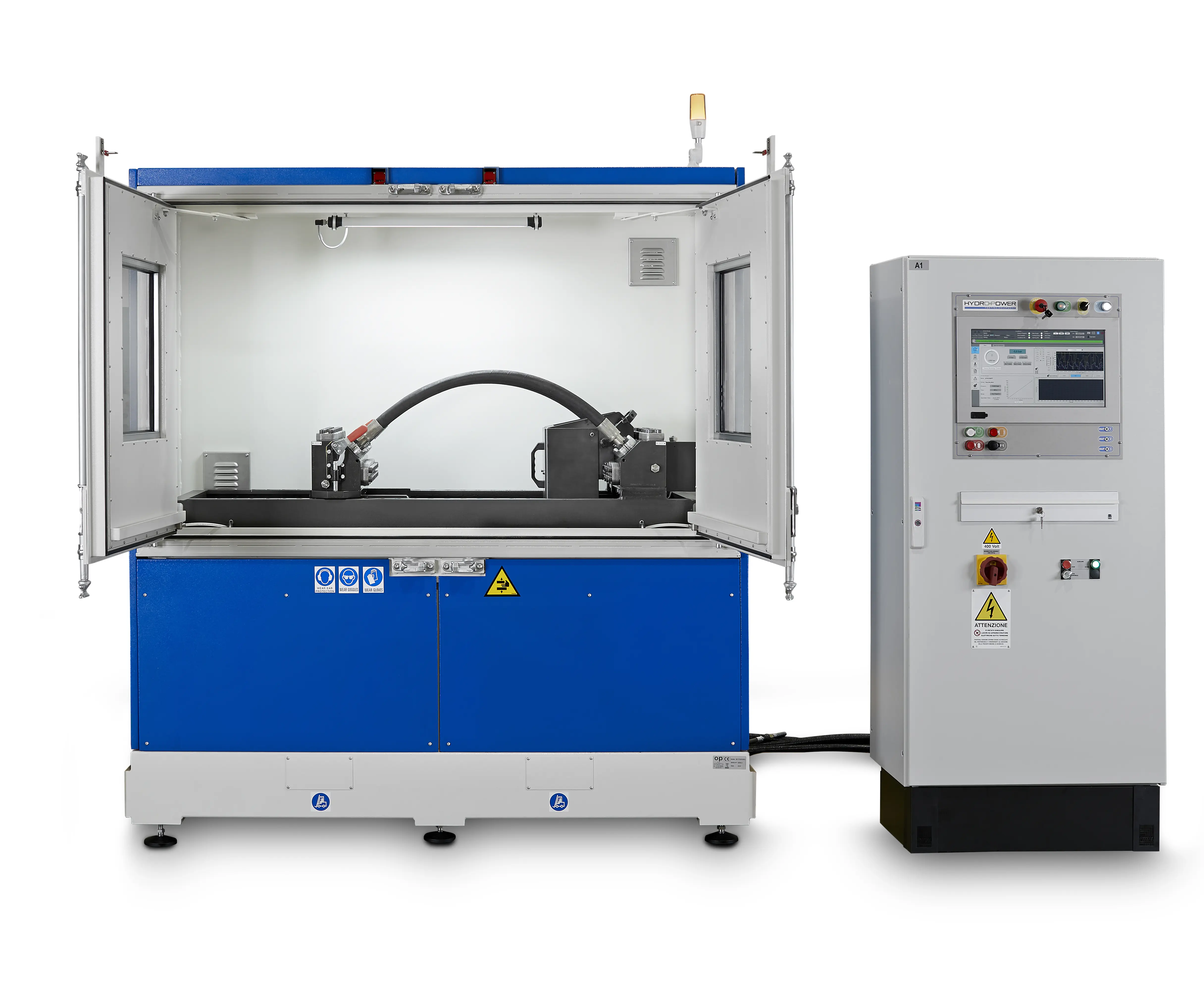 Il banco prova BCI700ES001 esegue test impulsi e a scoppio di componenti oleodinamici quali tubazioni rigide o flessibili, raccordi, innesti rapidi, valvole, in accordo alle specifiche SAE J343, ISO 6803 e ISO1402. DATI TECNICI • Onda di pressione secondo SAE J343 e ISO 6803 • Pressione massima di prova impulso 700 bar • Pressione massima di prova a scoppio 1500 bar • Pressione minima di prova 20 bar • Cilindrata/impulso 170 cm3 • Frequenza massima di prova 0,50 Hz • Temperatura massima olio 60° C DISPOSITIVI DI SICUREZZA: • Interblocco elettrico all'esecuzione del test in caso di sportello aperto • Finestre per la visualizzazione degli elementi sotto test • Fungo di emergenza • Interruzione automatica in caso di qualsiasi anomalia di funzionamento del banco ALIMENTAZIONI: • Tensione standard di 400 V – 50 Hz – trifase (a richiesta voltaggi speciali) OPTIONAL: • Assistenza remota online. • Sistema aspirazione fumi e disoleatore. • Pannello di controllo integrato (display touch-screen 19'') • Massello centrale aggiuntivo. • Rilevamento nebbia d'olio in camera di prova.