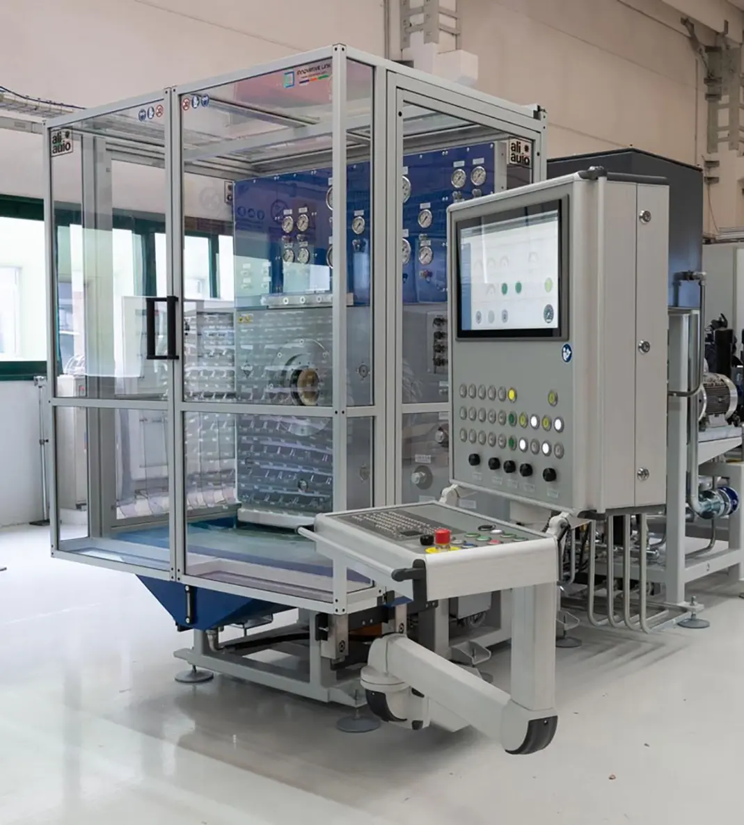 Il banco prova TSSL 55 NN è destinato al collaudo dinamico e funzionale di pompe oleodinamiche in circuito chiuso ed aperto. E’ possibile effettuare collaudi su pompe singole e doppie, a pistoni, a palette, ad ingranaggi o similari sia destre che sinistre. La macchina è in grado di collaudare anche motori a pistoni, a palette, ad ingranaggi in circuito aperto tramite blocco dedicato. DATI TECNICI • KW 55 • BAR 420 • L/MIN 250 • RPM 2800